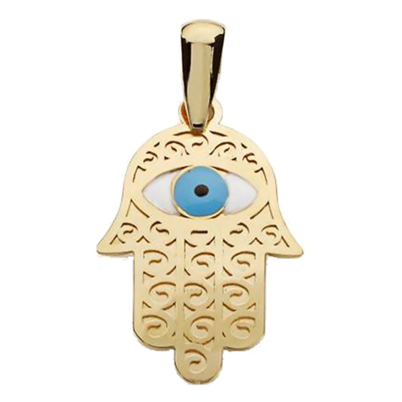 Symbolisant espoir et protection, ce pendentif main de Fatma est réalisé à partir d'or jaune 750/1000 (18K). Il est mis en lumière par sa couleur dorée qui se trouve rehaussée par une finition polie. Ce bijou, considéré comme un talisman, vous apportera protection au quotidien et sublimera votre style. Il prend la forme de main de Fatma au design singulier qui affiche des spirales géométriques et un œil laqué de couleur bleu, blanc et noir.