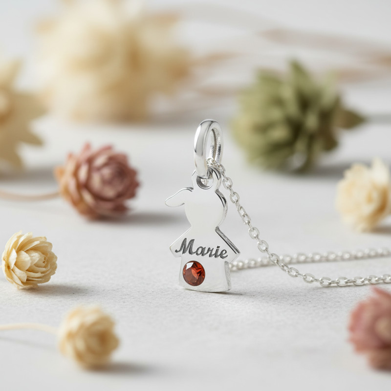 Vous pouvez faire graver le prénom de votre choix avec la police Anglaise uniquement. A chaque mois de naissance est associé une pierre :