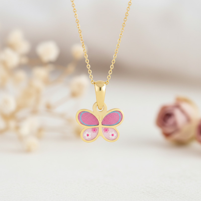 La marque Bambins vous dévoile ce superbe pendentif enfant en or jaune. Il fait partie de leur collection bijoux animaux et représente un ravissant papillon. Très lumineux et coloré, ce bijou vous est proposé en or jaune 375/1000 (9K) ou 750/1000 (18K) avec une partie recouverte d'émail rose.