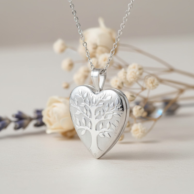 Ce pendentif porte photo coeur est un modèle qui est soigneusement sélectionné par notre équipe pour vous permettre de vous parer subtilement. Il est conçu en argent 925 rhodié et reflète une brillance argentée noble et élégante qui illuminera votre look au quotidien. Ce médaillon comporte un arbre de vie gravé sur une surface striée verticalement qui séduit par ses finitions polies et ses fascinants contrastes. Ce bijou symbolique sera votre porte-bonheur qui vous accompagnera dans tous les moments de votre vie.