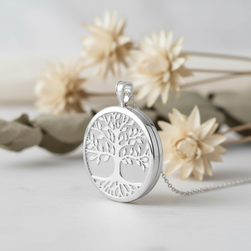 Ce pendentif porte photo rond est une belle incarnation de l'élégance épurée et sobre qui est conçu en argent 925 rhodié. Choisi parmi les fascinants bijoux d'Artemis, il représente son ADN à travers ses lignes polies, son dos satiné et sa décoration symbolique. Il présente à l'avant une surface striée mise en valeur par un arbre de vie. Ce motif est un symbole de force, de sagesse, de protection et de vie éternelle.