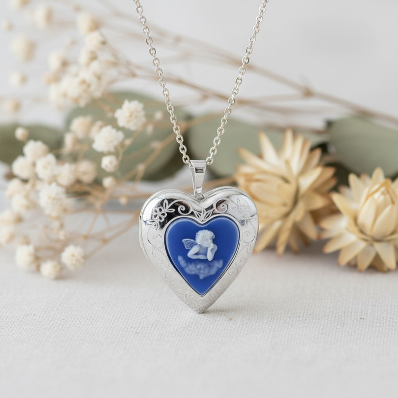 Nous vous présentons donc ce superbe pendentif porte photo en forme de coeur qui apportera une note d'amour et de raffinement à votre quotidien. Celui-ci fait en argent 925 mesure 20 mm de largeur et 25 mm de hauteur, incluant sa bélière. Il arbore une finition polie qui lui accorde un éclat subtil. Ce pendentif est magnifié aux bords par un design fleuri et est marqué au centre par un camé bleu. Celui-ci dévoile un ange chérubin de couleur blanche, symbole de la sainteté et la puissance.
