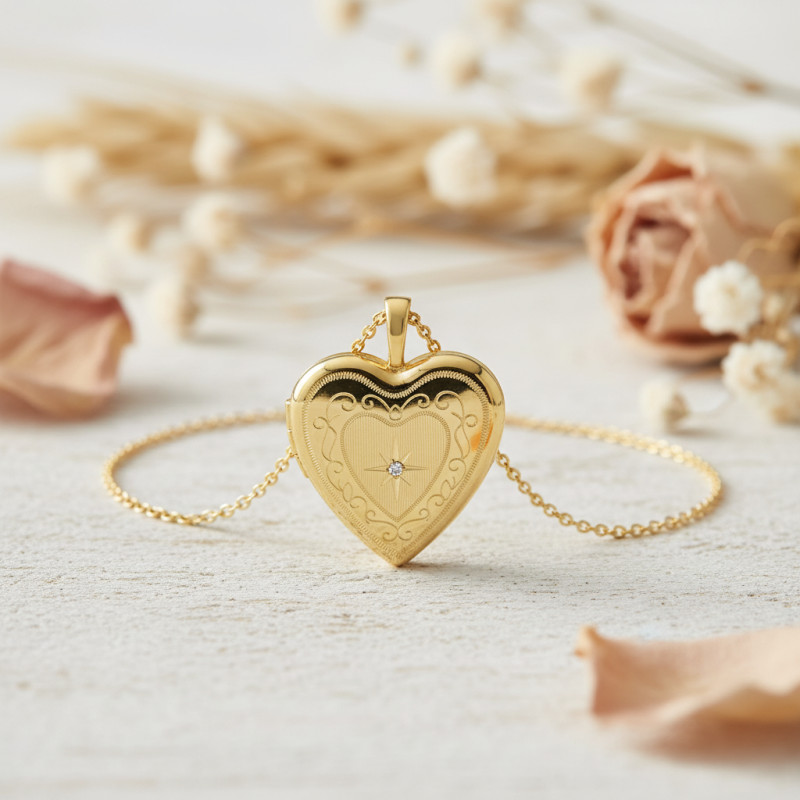 Nous vous invitons à découvrir l'un de ses magnifiques modèles qui est ce ravissant pendentif photo coeur qui soulignera subtilement votre look. Il est conçu en or jaune 375/1000 (9K) et reflète une allure polie qui est accentuée par le splendide diamant de 0,01 carat serti sur sa face avant. Cette pierre précieuse de 1,20 mm de diamètre est placée au centre d'une étoile gravée, elle-même occupant le centre strié sous forme d'un cœur. Celui-ci est joliment entouré par un ornement rappelant une arabesque délimitée par une ligne en zigzag. Cette combinaison de finitions et de décoration souligne la beauté et l'élégance de ce médaillon.