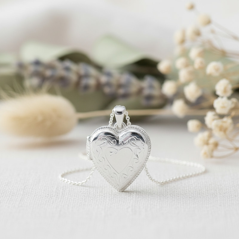 Comme ce beau médaillon photo qui a été réalisé entièrement en argent 925 pour être à prix doux et pour offrir une qualité durable. Ce bijou prend la forme délicate d'un coeur ce qui fera de lui un bijou romantique à offrir. Ce petit coeur est gravé sur son recto par plusieurs motifs fleuris. Il vous permettra de glisser en son intérieur deux photos de votre choix pour les porter au quotidien au plus prés de votre coeur.
