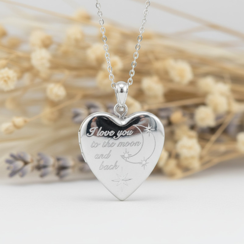 Découvrez ce charmant pendentif photo coeur. De couleur argentée, il est entièrement réalisé en argent 925 et comporte un espace qui vous permettra d'y insérer un portrait miniature. De couleur grise, il est sublimé par un fini rhodié assurant une résistance à l'usure et relevé par une jolie finition polie lui accordant cette allure brillante. Afin de renforcer son allure romantique, il se trouve marqué à l'avant par le message " I love you to the moon and back ". Ce dernier est gravé avec délicatesse, faisant de ce bijou le cadeau idéal pour une personne spéciale.