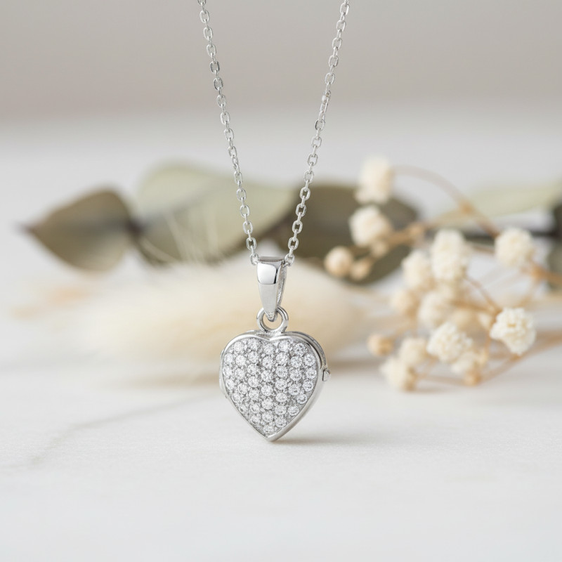 Nous avons le plaisir de vous présenter ce charmant pendentif porte photo à l'allure saisissante. Il se pare d'un ton argenté dû à sa composition en or blanc 375/1000 (9K). Pour plus d'élégance, il est sublimé par une finition polie qui vous offrira une touche brillante. Ce bijou prend la forme d'un cœur orné de pierre blanches particulièrement étincelantes. Il s'agit d'oxydes de zirconium qui illumineront votre cou à merveille tout en renforçant le prestige du bijou. Ces 40 gemmes de 2,00 mm de diamètre vous accorderont une note plaisante en toute occasion.