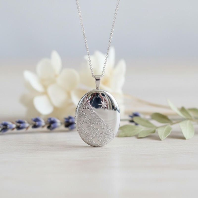 Succombez au charme de ce beau pendentif porte photo de couleur grise. Réalisé en argent 925, il vous accompagnera dans toutes vos aventures sur de longues années. Ce dernier arbore une forme ovale et présente sur son côté droit la gravure d'une étoile sur une finition polie. Sur le côté gauche de ce modèle, vous trouverez des empreintes de pas polis présents sur le motif texturé. Au dos de ce médaillon, est apposée l'inscription : « When you saw one set of footprints it was then that I carried you ».