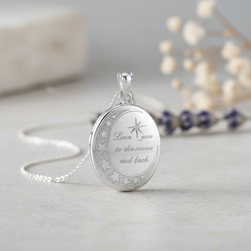 Ce pendentif photo saura parer votre cou avec distinction. Il est façonné en argent 925 rhodié et arbore un charmant ton gris qui vous permettra de le porter au quotidien. De forme ovale, il affiche 34 mm de hauteur pour une largeur de 20 mm et arbore de ravissantes gravures qui lui dénotent un bel aspect. Il s'agit d'une rangée de motifs étoilés sur une lune accompagnant l'inscription "Love you to the moon and back", gage d'amour et d'affection.