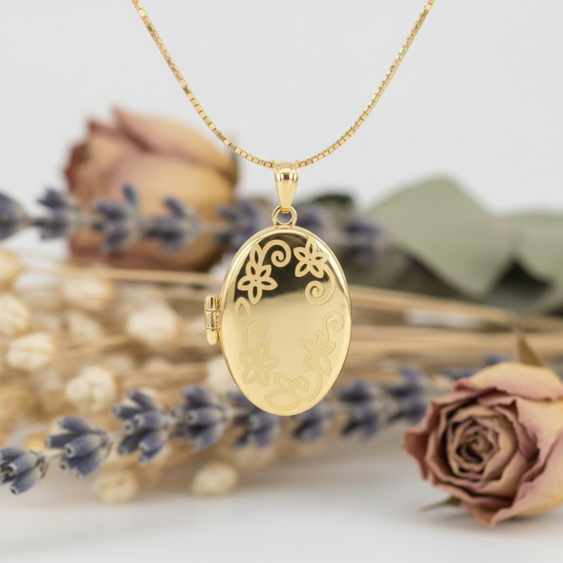 Nous avons choisi de vous proposer en collaboration avec la maison ce sublime pendentif photo ! Il est entièrement réalisé tout en or jaune 375/1000 (9K) pour vous offrir une belle couleur jaune. Il prend une forme ovale et nous dévoile sur son recto un motif de fleur très apprécié par les femmes. Ce pendentif photo vous permettra de glisser deux photos de votre choix. Une finition polie est également présente pour qu'il brille de mille feux.