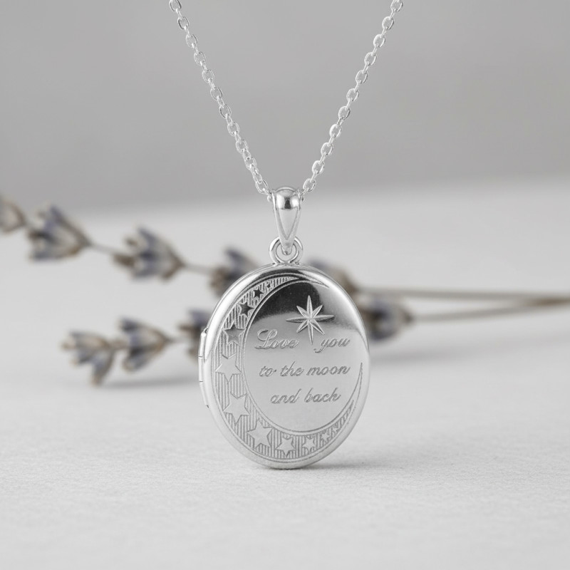 Aujourd'hui, nous avons choisi ce magnifique pendentif photo ovale pour vous. Simple et raffiné, il est réalisé en argent 925 rhodié, ce qui assure une résistance à l'usure ainsi qu'une brillance durable. Il arbore une surface polie de 27 mm de hauteur et 15 mm de largeur sur laquelle sont gravés des motifs charmants. Il s'agit d'une lune placée en bordure et striée avec des étoiles accompagnées d'un magnifique poème en anglais ‘ Love you to the moon and back'. Plus haut, est placée une rose des vents, figure indiquant les points cardinaux et les orientations intermédiaires. Ce pendentif fera le cadeau idéal lors d'une occasion spécial.