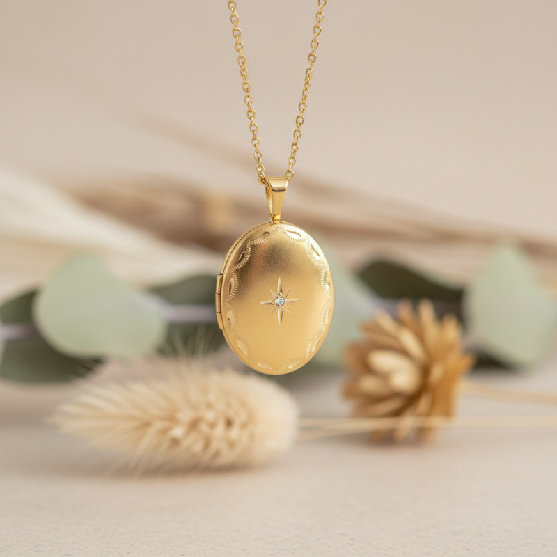 Nous avons choisi en collaboration avec la maison de vous présenter ce beau pendentif photo ! Ce modèle a été réalisé entièrement en or jaune 375/1000 (9K) pour garder son éclat des années. Il vous est proposé dans une forme ovale et est sublimé par un charmant motif étoile. Cette étoile est dotée en son centre d'un oxyde de zirconium apportant de la brillance. Vous pourrez y glisser deux belles photos de vos proches pour les porter près de votre coeur.