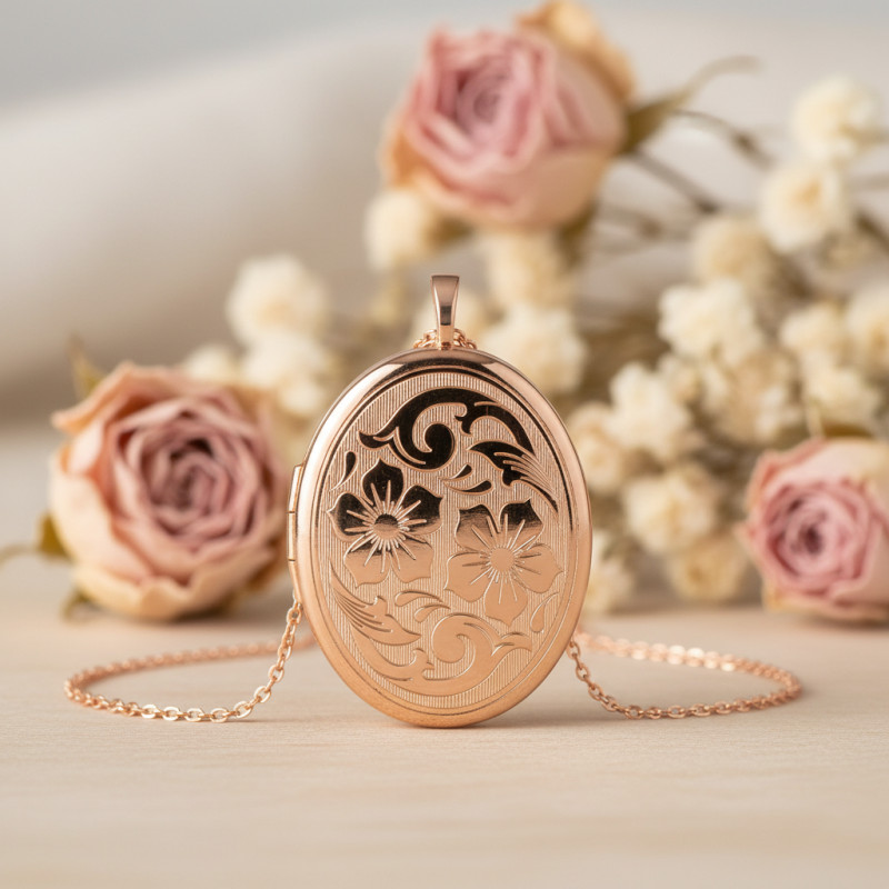 Le bijou Emanessence que nous vous proposons donc aujourd'hui est un pendentif porte photo qui vous sublimera une fois acquis en devenant votre compagnon du quotidien. Celui-ci est réalisé en or rose 375/1000 (9K) avec une finition polie qui met en avant son intemporalité. Il prend une forme ovale de 20 mm de largeur et 32 mm de hauteur, y compris la bélière, et dévoile un design texturé souligné par des lignes rainurées et des motifs de fleurs.