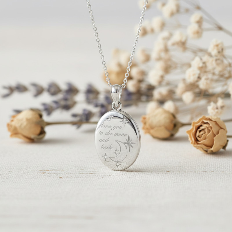 Nous avons choisi ce ravissant pendentif photo ovale pour vous. Argenté, il est réalisé en argent 925 et relevé d'une finition polie lui apportant cette allure brillante. De forme ovale, il est plaqué au rhodium afin de lui assurer une bonne résistance à l'usure. Il est sublimé à l'avant par des roses des vents, une lune et par le message " I love you to the moon and back " et présente un ouvrant sur charnière qui vous permettra d'y glisser le souvenir de votre choix.