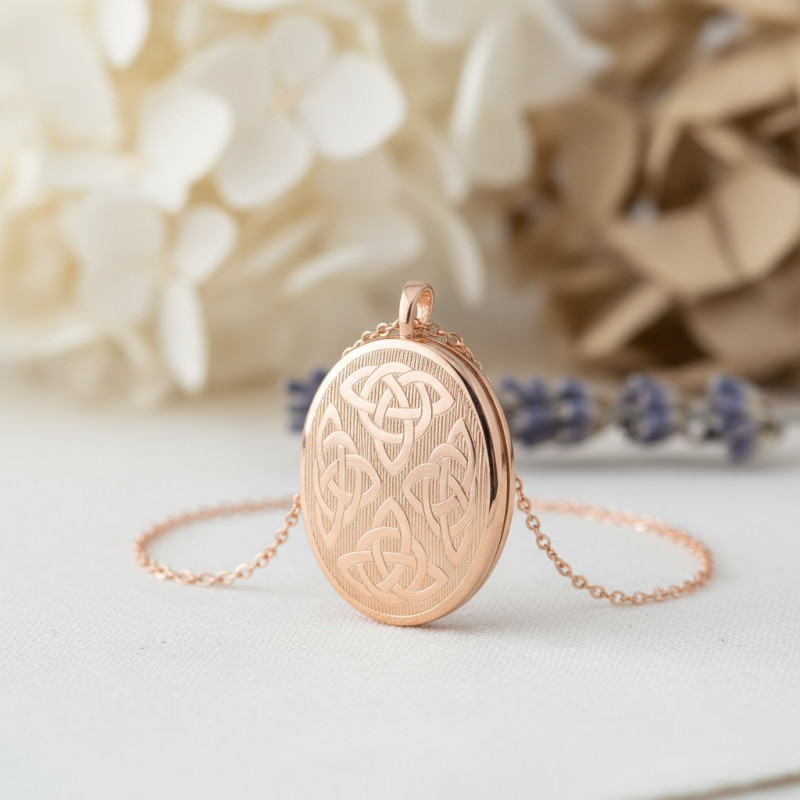 Succombez au charme de ce magnifique pendentif porte photo de forme ovale et de couleur rose doré. Il se pare de finitions polie et rainurée qui accentuent son esthétique. Notez que ce bijou est fabriqué à partir d'or rose 375/1000 (9K) et il est dédié à la gent féminine. Ce dernier présente sur son recto un motif celtique qui lui confère une touche élégante. Vous pourrez faire de ce pendentif un allié ultime pour vos différentes sorties ou faire de lui un cadeau à offrir à un être cher.