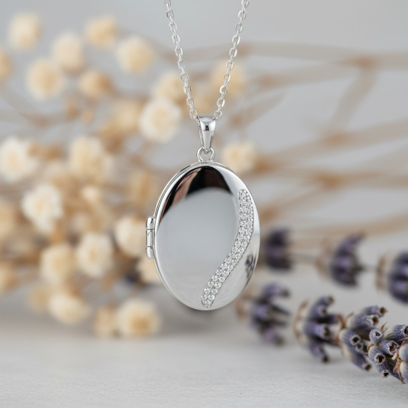 Nous vous invitons donc à opter pour ce merveilleux pendentif photo ovale afin de garder la photo d'une personne chère près de votre cœur ! Ce bijou a été conçu en argent 925 et est plaqué au rhodium, ce qui lui permet de conserver son éclat pendant de longues années. Il se présente sous une forme ovale de 35 mm de hauteur et 7 mm d'épaisseur. Ce pendentif dévoile sur sa surface polie un double pavé courbé d'oxydes de zirconium ronds et blancs, lui accordant un charme étincelant.