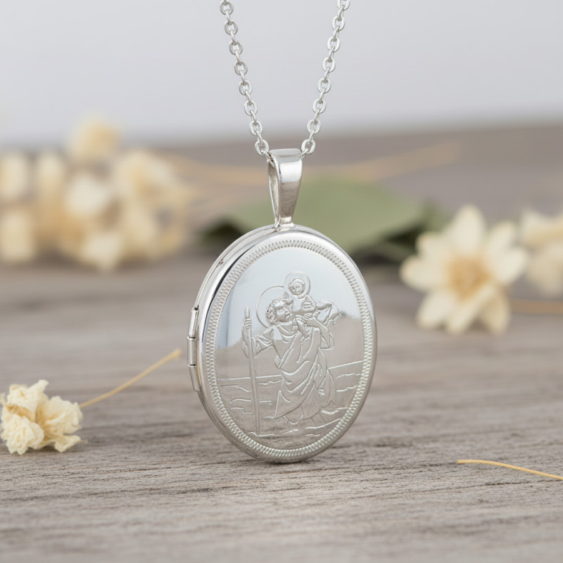 Original et religieux, ce pendentif porte photo rend hommage à la fidélité et à l'amour. Ce bijou de dévotion arbore une forme ovale et est réalisé en argent 925. Il présente un contour texturé et une gravure de Saint-Christophe, martyre du IIIe siècle. Passeur de son métier, le saint aurait été sollicité par l'enfant Jésus qu'il porta sur ses épaules pendant la traversée. Gage de protection divine, il est sublimé par une finition polie qui ajoutera de l'éclat à vos tenues.