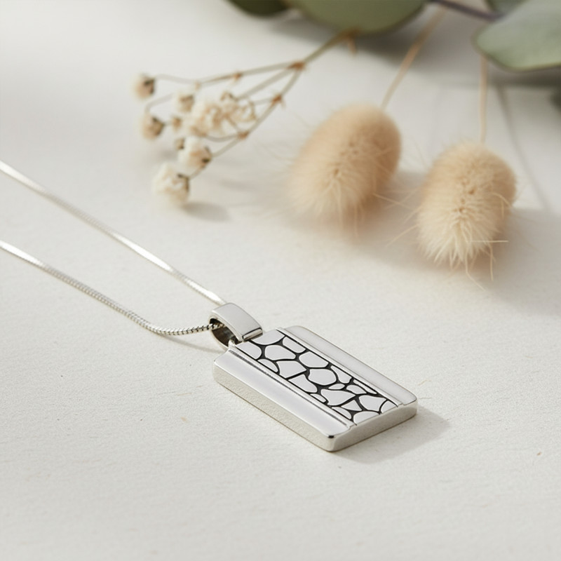 Nous vous proposons donc ce charmant pendentif de forme rectangulaire, réalisé en argent 925/1000. Ce modèle vous révèle en son centre, une bande aux motifs semblables à des écailles de reptiles. Ce motif est directement gravé dans la matière et détouré en noir, apportant du contraste et du relief au pendentif. Ce bijou sera le cadeau idéal pour une occasion spéciale comme un anniversaire, une cérémonie ou toute autre fête. De plus, sachez que ce modèle est personnalisable, alors pour un cadeau encore plus symbolique, nous vous invitons à faire graver le verso de ce pendentif. Vous pourrez y inscrire le prénom, la date ou le message de votre choix. Ce modèle mesure 15 mm de largeur sur 22 mm de hauteur. Son poids d'argent quant à lui est de 7,40 grammes.