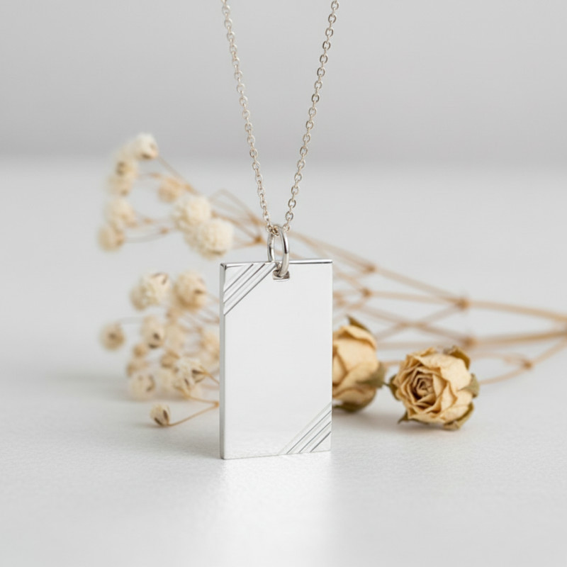 Découvrez alors ce ravissant modèle de forme rectangulaire, conçu entièrement en argent 925/1000. Ce pendentif vous dévoile dans son coin supérieur gauche et son coin inferieur droit, trois petites rainures, apportant relief et texture au bijou. Vous pourrez ainsi ajouter la gravure de votre choix au centre ou au verso du pendentif, comme un prénom, une date ou encore un mot, afin de rendre ce bijou encore plus personnel. Il fera donc un cadeau parfait à offrir à une personne qui fête son anniversaire ou à l'occasion d'une cérémonie religieuse, comme la communion. En ce qui concerne ses dimensions, ce modèle mesure 15 mm de largeur sur 24 mm de hauteur et pour un poids d'argent moyen de 2,40 grammes.