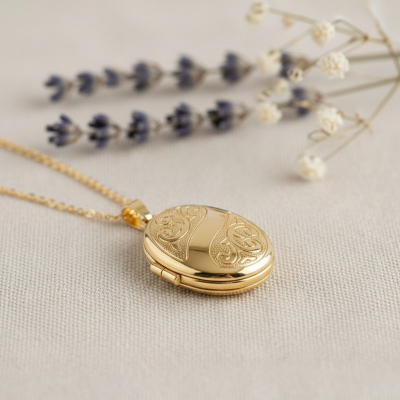Nous avons choisi en collaboration avec la maison de vous dévoiler ce somptueux modèle. Ce pendentif porte photo a été réalisé entièrement en or jaune 375/1000 (9K), vous permettant de l'acquérir à un prix abordable sans perdre de qualité. Ce pendentif dispose d'une forme ovale et nous dévoile sur son recto de charmants motifs gravés de type arabesques. Apportant son charme au bijou, les motifs viennent protéger deux photos de votre choix.