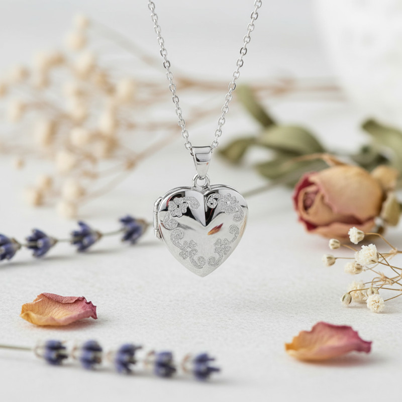 Idéal pour un cadeau unique et symbolique ou pour parer votre cou au quotidien, nous vous proposons ce sublime pendentif porte photo de forme coeur. Il est fait à partir d'argent 925 et se pare d'une finition polie qui lui accorde une brillance accrue. Son charme est d'autant plus accentué par les gravures florales qui parent son avant.
