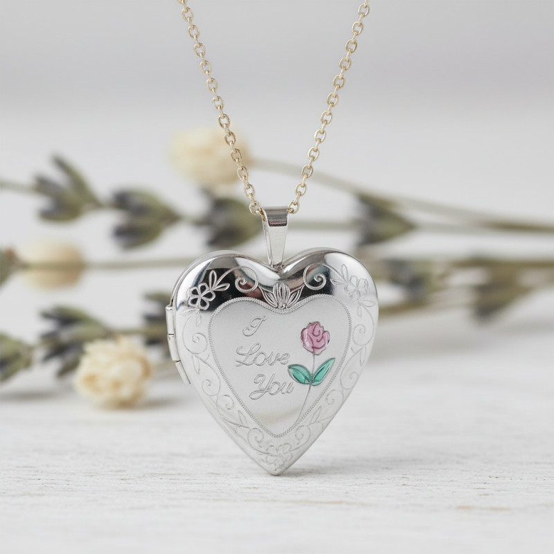 Découvrez donc ce merveilleux pendentif porte photo en argent 925 sélectionné avec soin par nos équipes pour vous embellir. Celui-ci affiche une largeur de 20 mm et une hauteur de 25 mm, incluant la bélière. Il arbore une forme de coeur finement épurée aux bords magnifiés par un design fleuri. Ce pendentif se pare d'une finition polie pour un rendu brillant et présente au centre une rose et l'inscription "I Love You".
