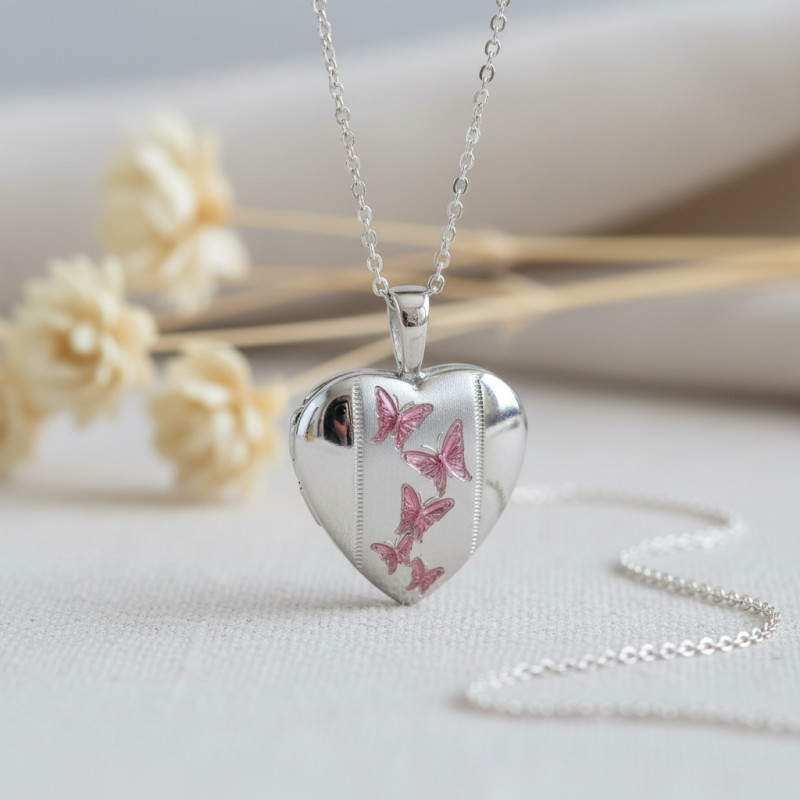 Ajoutez de la douceur et de la romance à vos tenues en misant sur ce superbe pendentif porte photo conçu en argent 925. En forme de cœur, il arbore une bande satinée aussi fascinante qu'élégante. Cette dernière est sublimée par de ravissants papillons de couleur rose soigneusement gravés. Le résultat est irrésistible et fait de ce bijou, une création d'exception. Féminine, douce et raffinée, ce médaillon sublimera vos tenues par son allure et apportera une note romantique à votre look.
