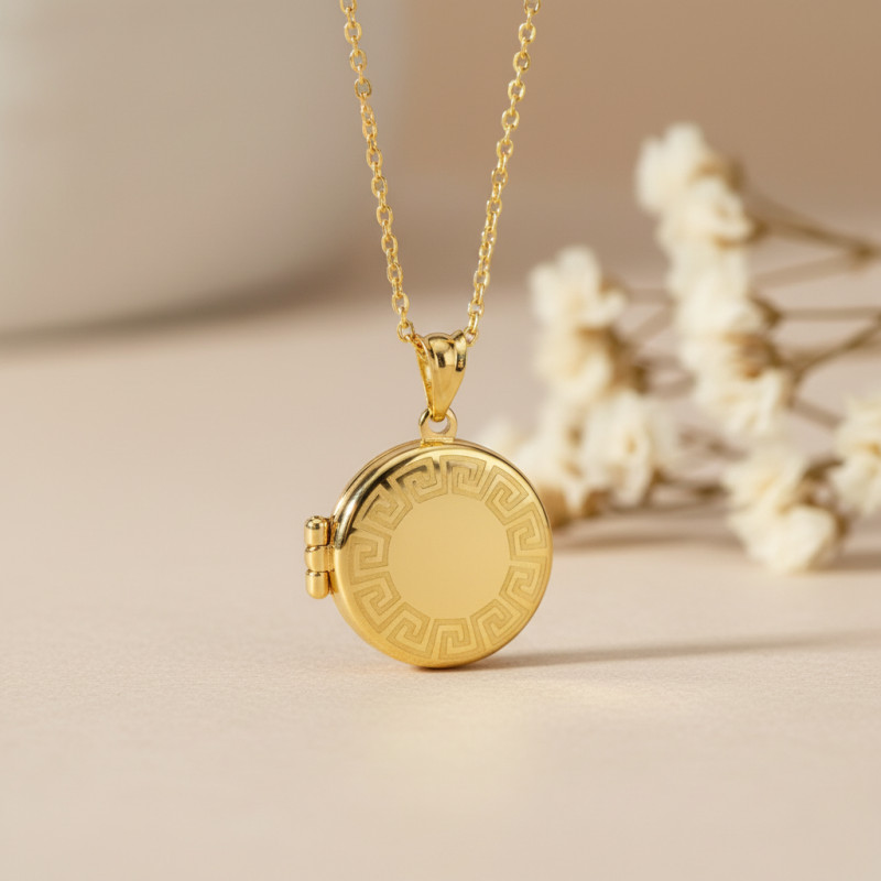 Nous avons choisi en collaboration avec la maison de vous proposer ce beau pendentif photo ! Celui-ci a été réalisé tout en or jaune 375/1000 (9K) pour être à prix doux sans perdre son éclat. Il prend une forme ronde et nous dévoile un élégant motif grec qui va vous faire craquer ! Ce pendentif de type porte photo vous permettra de glisser deux photos de votre choix pour les porter au plus près de votre coeur.