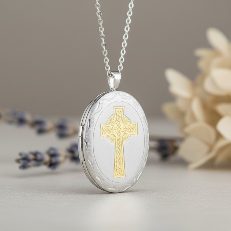 Médaille Précieuse vous dévoile donc ce magnifique pendentif porte photo au charme intemporel et au fort symbole. Fabriqué en argent 925, il présente au centre une croix celtique de couleur dorée qui lui accorde un aspect plus profond. Celle-ci est gravée sur une surface satinée. La bordure du bijou se pare d'un motif texturé pour un effet plus exquis. Ce pendentif de forme ovale dispose d'une bélière polie avec laquelle il fait 32 mm de hauteur. Sa largeur est de 20 mm.