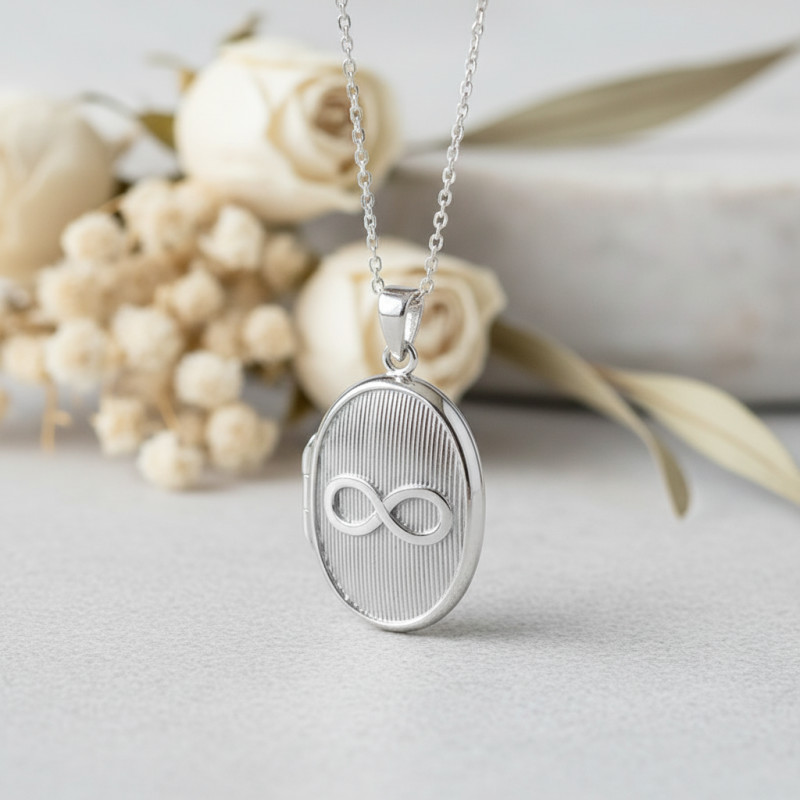 Parmi ses magnifiques modèles, nous avons choisi de vous proposer ce ravissant pendentif porte photo ovale de couleur argentée. Ce médaillon photo conçu en argent 925 est mis en valeur par un placage au rhodium et une finition polie qui lui confèrent de beaux contrastes qui ne manqueront pas de vous émerveiller. Sa surface avant est striée verticalement et comporte le symbole infini qui a une forte signification représentant l'éternité et l'amour pour toujours. Il est également symbole de sagesse, de réflexion, d'harmonie et d'amitié, ce qui fera de ce pendentif un cadeau très spécial à offrir à une personne très chère.