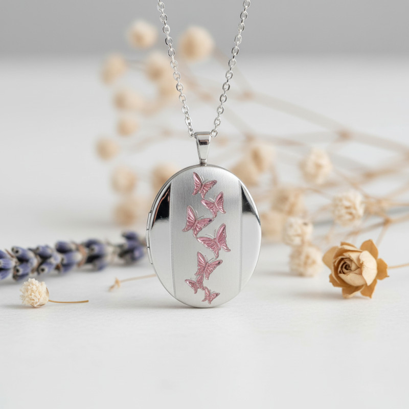 Laissez-vous séduire par le style unique de ce pendentif porte photo en argent 925. De forme ovale, il présente une allure classique et raffinée qui ne manquera pas de vous séduire. Son aspect poli et satiné est décoré de magnifiques papillons de couleur rose pour un plus bel effet. C'est un bijou ultra-féminin qui soulignera votre élégance et qui vous vaudra un look épuré.