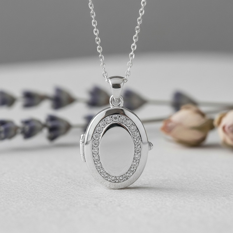 Ce sublime pendentif porte photo est confectionné en argent 925. Sa couleur grise et sa finition polie accentuent son côté élégant et distingué. De forme ovale, ce modèle arbore une forme circulaire et présente sur sa face avant un ensemble de 23 oxydes de zirconium de 1,00 mm de diamètre qui magnifient son allure et accentuent son allure éclatante. Serties à grains, ces pierres blanches apportent à ce bijou une touche de raffinement.
