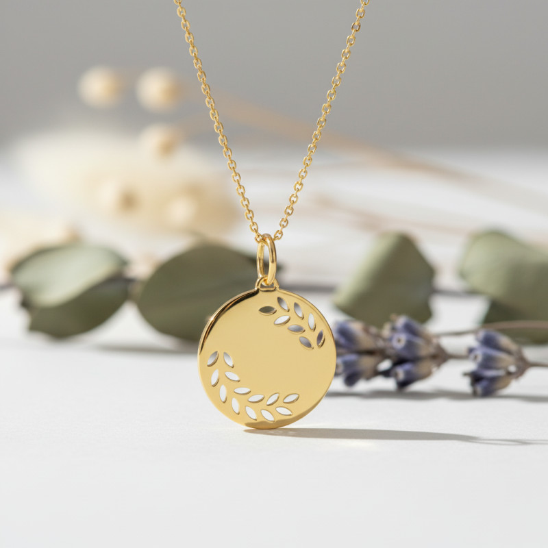 Apportez une touche d'élégance intemporelle à votre collection de bijoux avec ce magnifique pendentif en or jaune 375/1000 (9K) signé Emanessence. D'un diamètre de 20 mm, cette médaille arbore un design raffiné avec des motifs ajourés en forme de feuilles, évoquant la nature et la délicatesse. Son éclat doré illumine le cou avec subtilité, offrant un bijou à la fois discret et sophistiqué, parfait pour toutes les occasions.