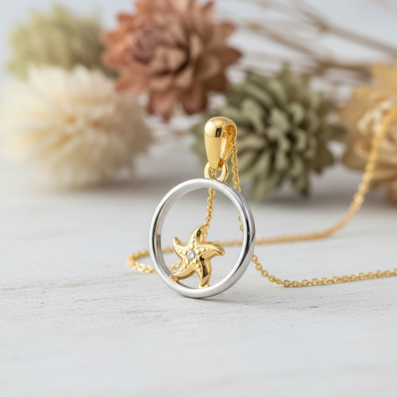 Ce superbe pendentif ajouré vous séduira grâce à sa couleur argentée et sa finition polie qui rehausse sa brillance. De forme ronde, il est réalisé en 2 ors 750/1000 (18K) pour une résistance accrue sur de longues années. Celui-ci est magnifié par un motif étoile de mer de teinte dorée qui se trouve mis en avant au centre par une pierre blanche qui vient compléter son style.