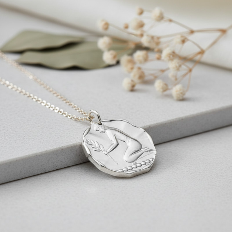 Ce sublime pendentif Vierge est parfait pour accompagner votre style. Fabriqué en argent 925 sablé avec un poids de 6 grammes, il est un véritable bijou de finesse et de symbolisme. Avec un diamètre de 24 mm, il arbore le signe astrologique de la Vierge. L'illustration au centre représente une femme aux longs cheveux, délicatement agenouillée, en train de planter une tige de rameau à neuf feuilles. Ce dessin est le symbole de la paix et la sagesse.