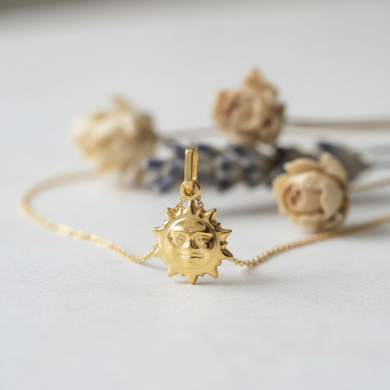 Craquez alors pour la beauté et la symbolique de ce fabuleux pendentif conçu entièrement en or jaune 375/1000. Ce modèle vous dévoile un ravissant soleil à l'étincelante finition polie et brillante. Il est représenté avec un visage, symbolisant le pouvoir, la sagesse, la prospérité et la connaissance. Il est également une source d'inspiration infinie, c'est pourquoi vous pourrez offrir ce bijou à une personne passionnée par l'astronomie, ou par l'astrologie, pour l'aspect plus spirituel du soleil. Pour un style encore plus personnel, n'hésitez pas également à porter ce pendentif en accumulation avec d'autres colliers ou chaines en or. En ce qui concerne ses dimensions, ce pendentif possède une hauteur de 18 mm, bélière incluse, sur une largeur de 12 mm et pour un poids d'or moyen de 0,48 gramme.