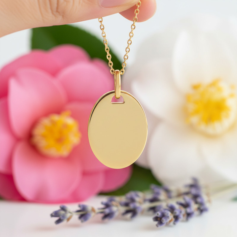 Voici une plaque en or de forme ovale de la maison Emanessence. Elle est proposée en or jaune 375/1000 (9K) ou 750/1000 (18K) et mesure 15 mm de hauteur pour une largeur de 11,50 mm. Un format plutôt discret et facile à porter au quotidien.