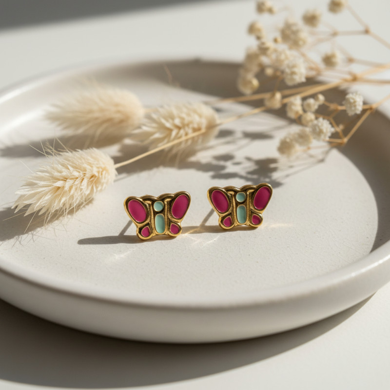 L'équipe de Médaille précieuse est heureuse de vous présenter cette jolie paire de boucles d'oreilles papillon enfant et fille en forme de papillon. Tricolore, elle est composée d'or jaune 375/1000 (9K) ou 750/1000 (18K) en fonction de votre choix, de bleu pour le corps et de rose pour les ailes.
